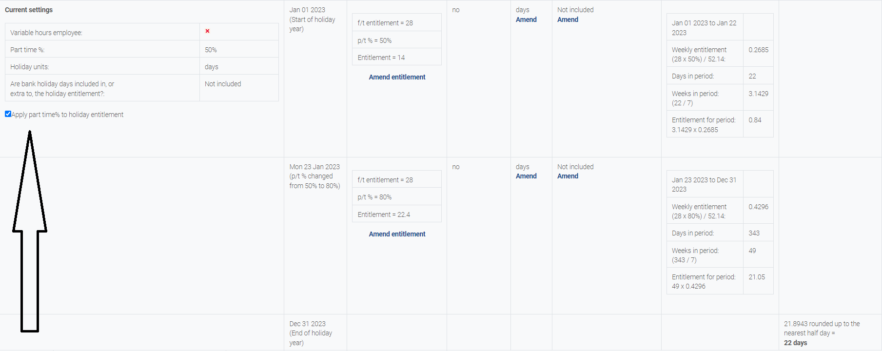 Previously the p/t% was applied to the holiday entitlement via a tick box option at Management > Holidays > Holiday entitlement > apply part time percentage to an entitlement.
