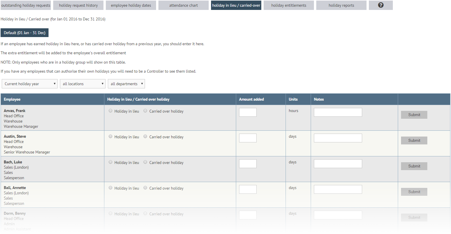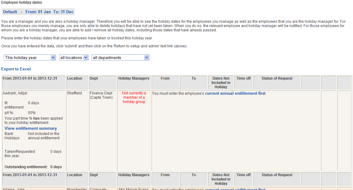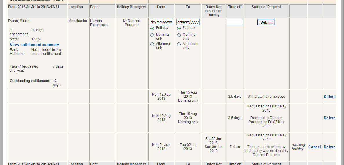 Users have their holiday entitlements assigned during the New Employee Wizard, but can be administered by managers (with the correct rights) and controllers.