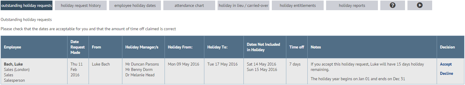 Note – If your organisation uses a two stage approval process for holiday requests, notes to that effect will be shown. Further details can be found in the guide to two-stage holiday approval.