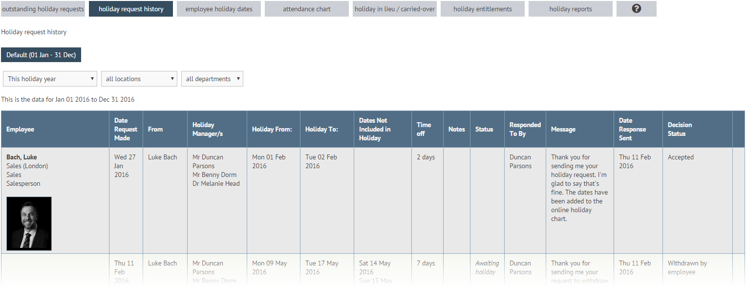 Holiday request history will show previous requests, filterable across various departments within the organisation.