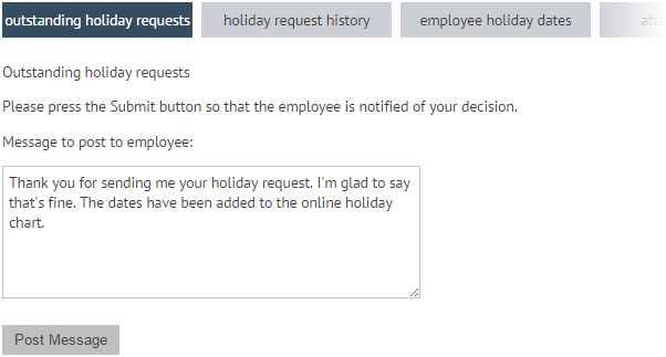When employees submit requests for holidays a note will appear in your message board, you’ll receive an email, and the actual request will be visible in the Outstanding holiday requests tab.