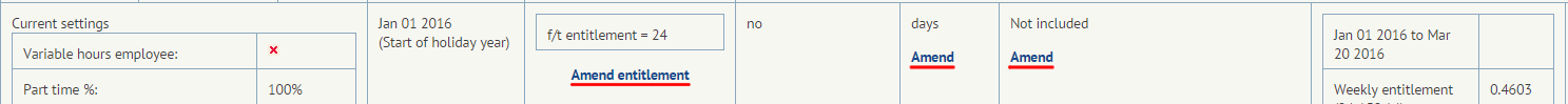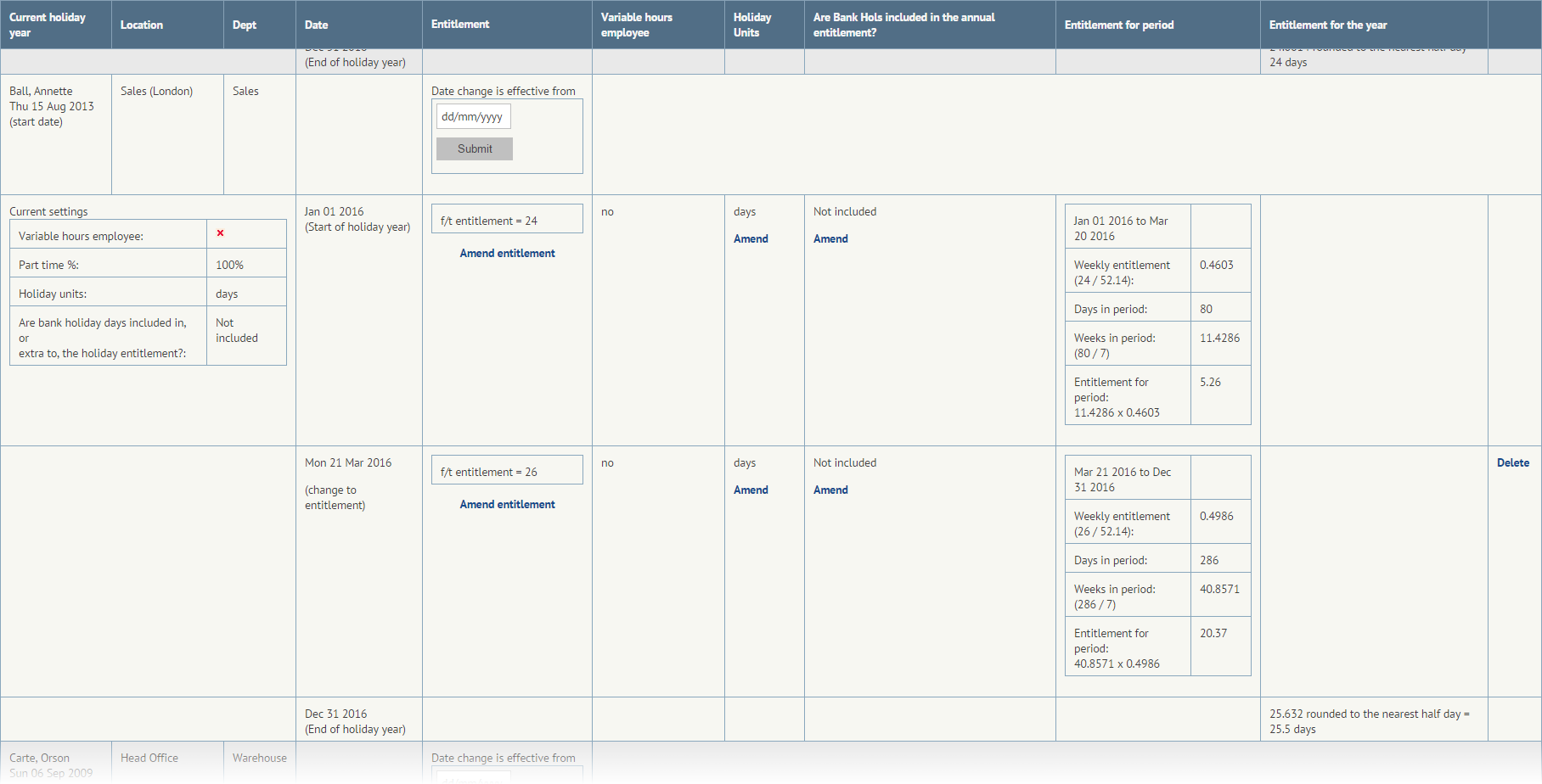 Entitlements are administered from the employee holiday dates tab. Users that need holiday entitlements assigning are indicated with with a link ‘You must enter the employee’s current annual entitlement first'. Following the link will show various aspects of the employee’s entitlements.