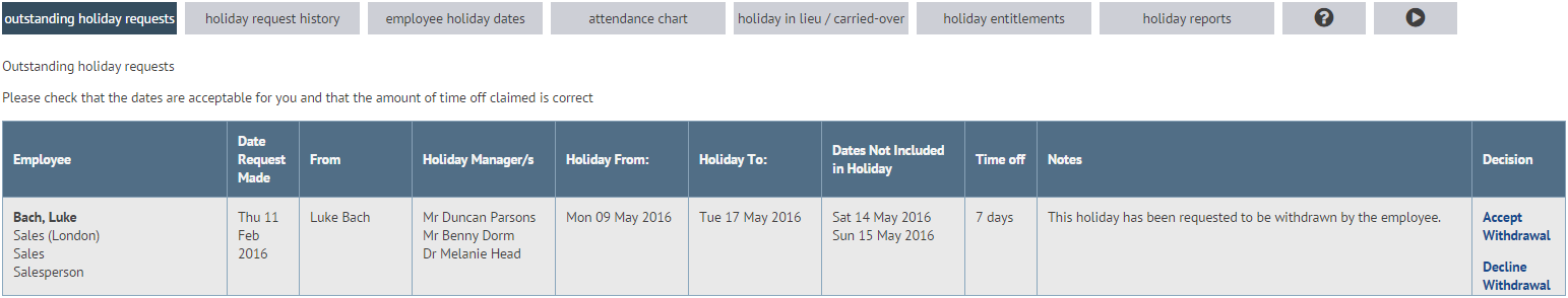 It may be that, after a holiday is booked and approved, an employee wishes to withdraw a holiday request. If this happens, a request to withdraw will appear on both your message board and outstanding holiday requests.