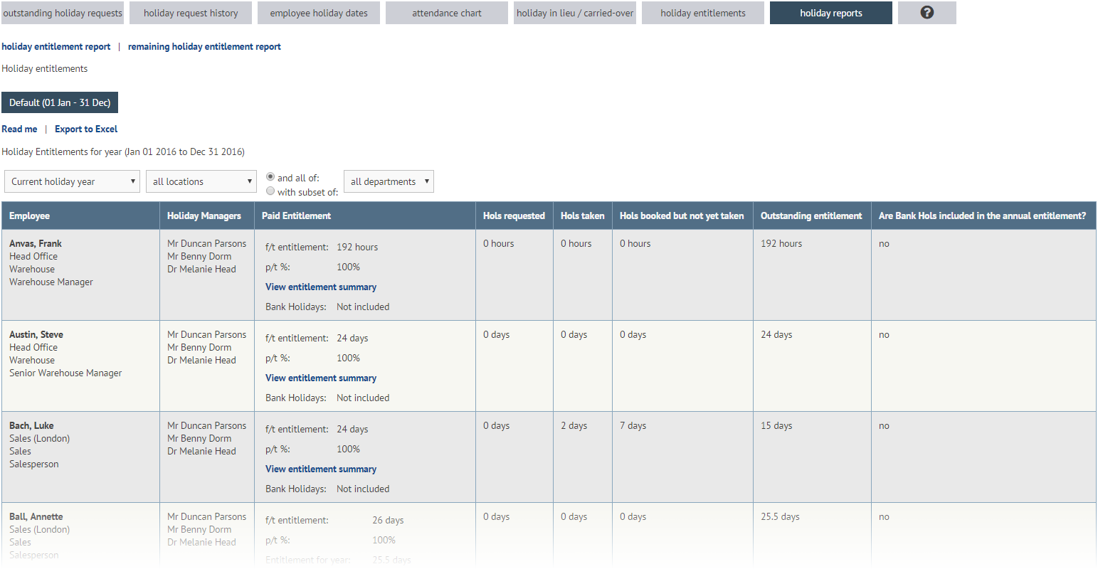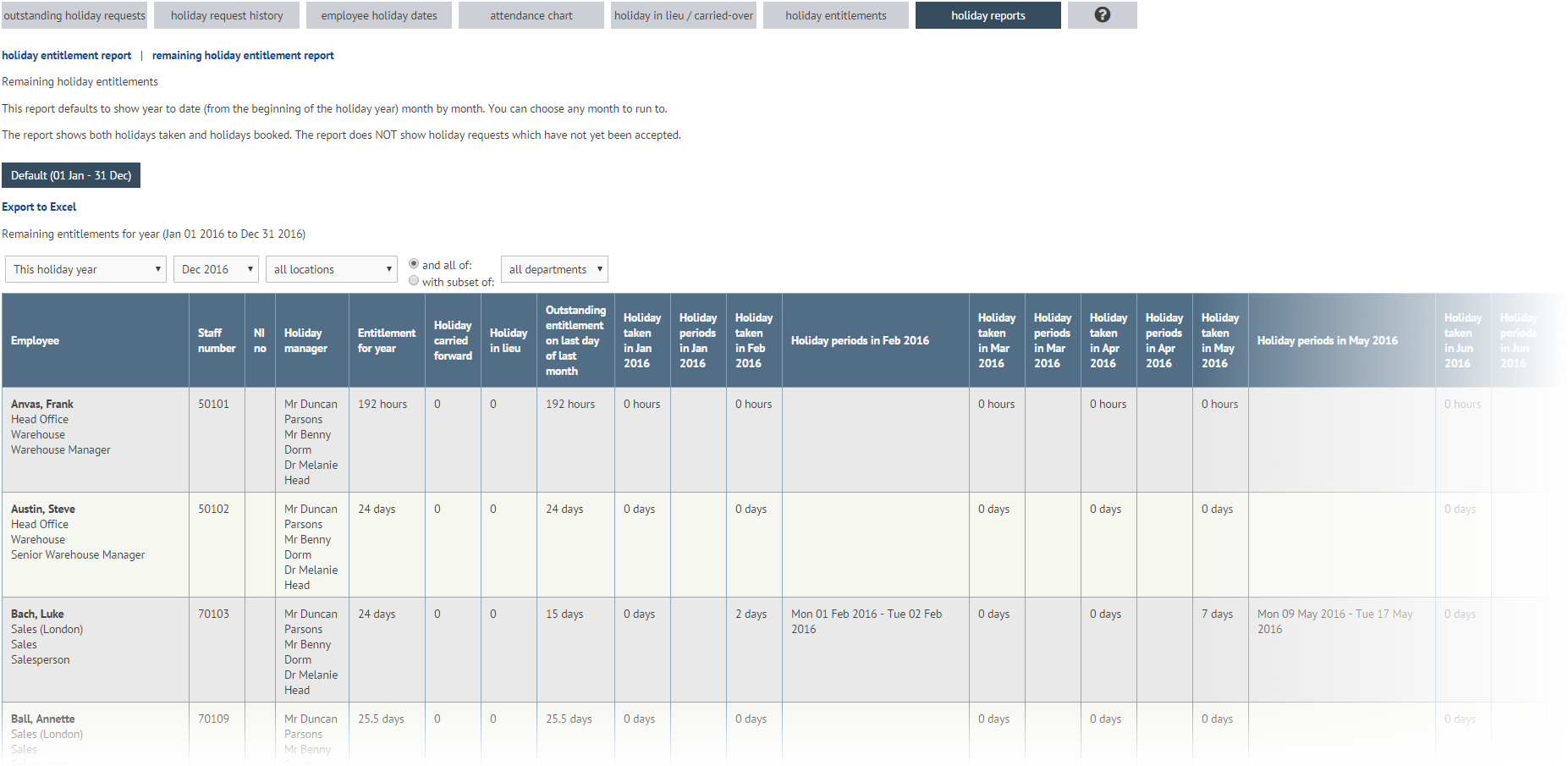 The Remaining holiday entitlement report, like the entitlements report, is a filterable grid giving a more in–depth view of employee holidays, both taken and remaining, on a month by month basis with year–to–date figures. The view can also be saved in a format ready for Excel.