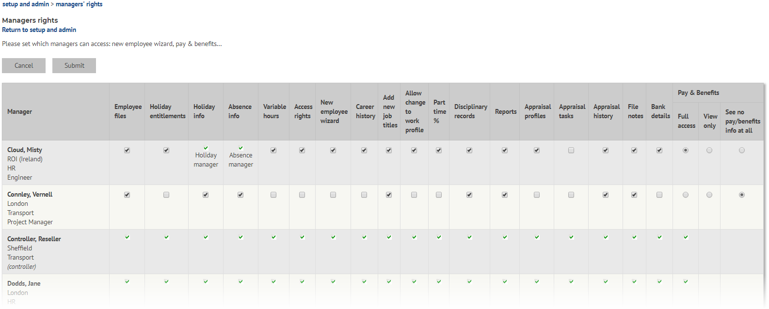 All the Managers are listed in the table, along with tick boxes for each of the functions available for configuration. Some items are simple binary choices, others have more granulated access available (e.g. Appraisals, Pay & Benefits). Some Managers have access to certain features by default as a result of being Holiday or Absence Managers.